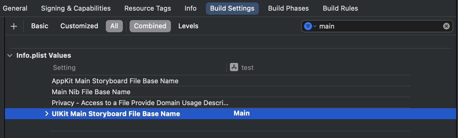 왼쪽 상단에 프로젝트 이름으로 된 파일 클릭 -> 화면에 TARGETS 클릭 -> 중앙 상단에 Build Settings 클릭 -> main 검색 -> UIKit Main Storyboard File Base Name 삭제