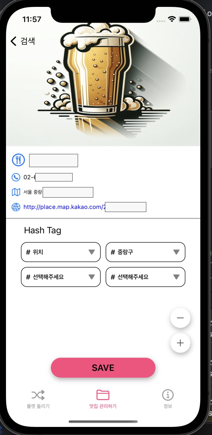첫번째 그림은 제 <뭐 먹지? 태그로 관리하는 맛집 & 룰렛 > 앱에서 맛집을 저장하거나 수정하는 페이지 입니다.