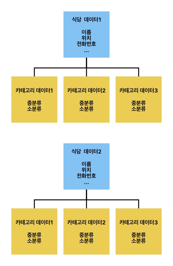 그래서 데이터 구조는 아래의 그림처럼 하나의 식당에 여러개의 태그가 들어가는 형식으로 처리되어야 했습니다.