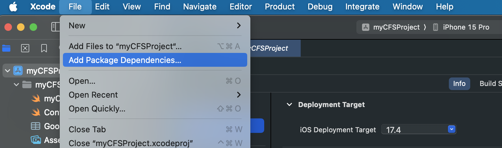 프로젝트 창을 여시고 File -> Add Package Dependencies를 눌러줍시다.