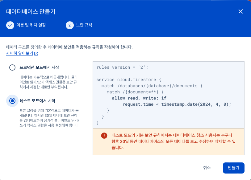 1. 파이어 스토어 데이터 베이스 만들기