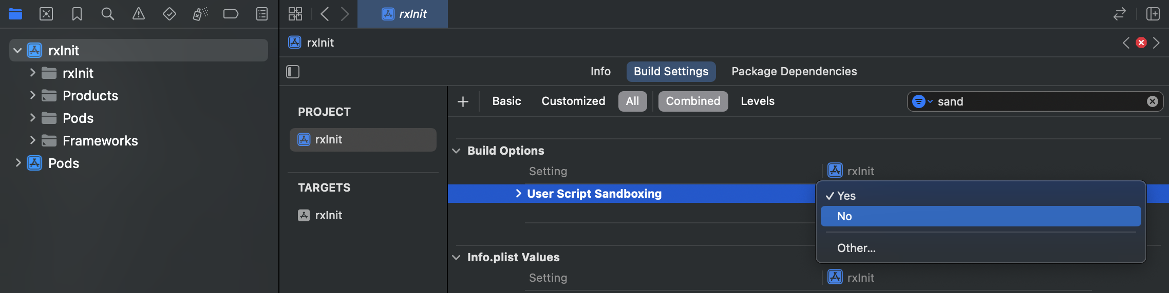 프로젝트 => Build Settings => User Script Sandboxing => No로 설정해주시면 됩니다. (진짜 끝!)