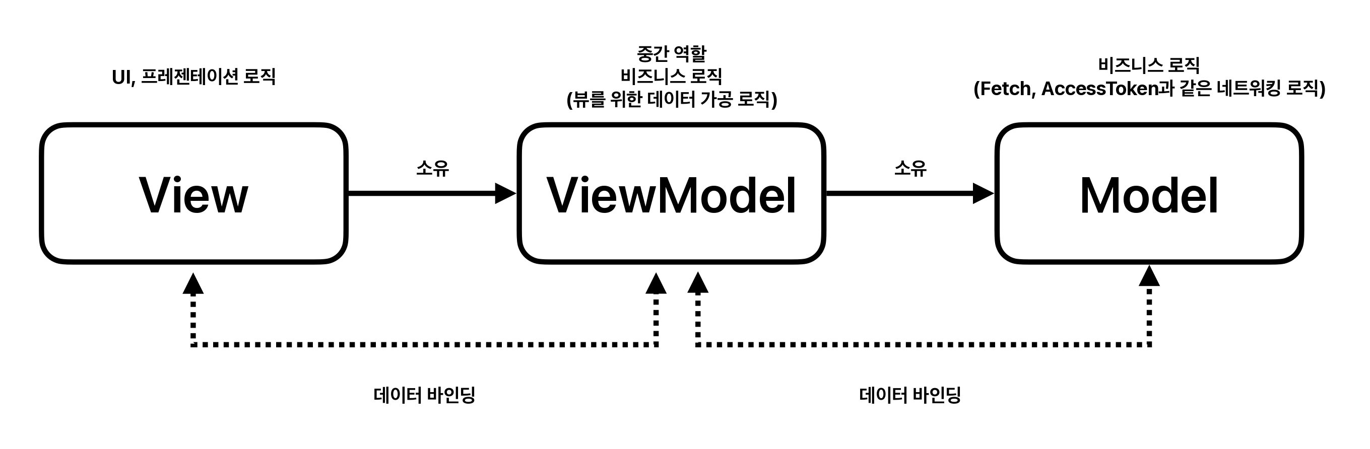 MVVM 패턴은 Model - View - ViewModel 로 이루어져 있습니다.