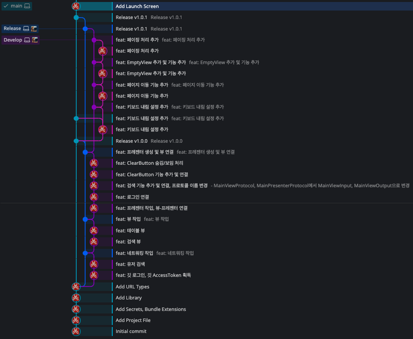 제가 이번에 MVP 패턴을 학습하며 적용한 Git Flow 적용 사례입니다!