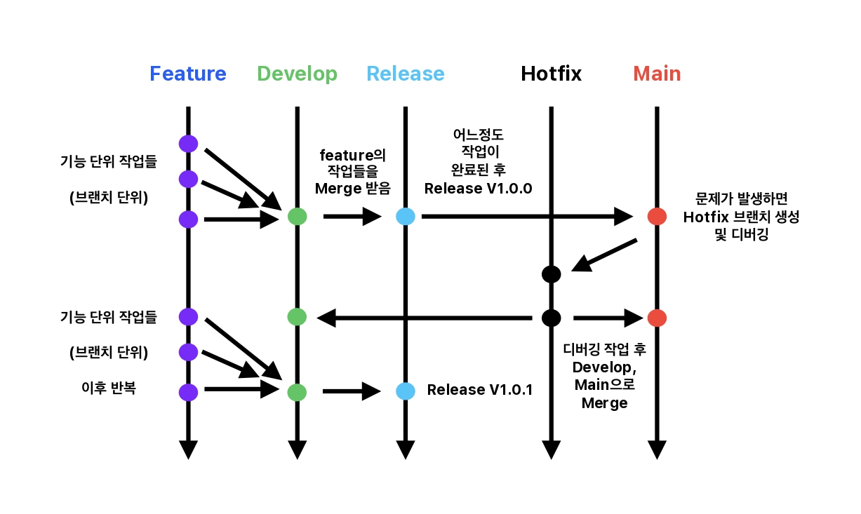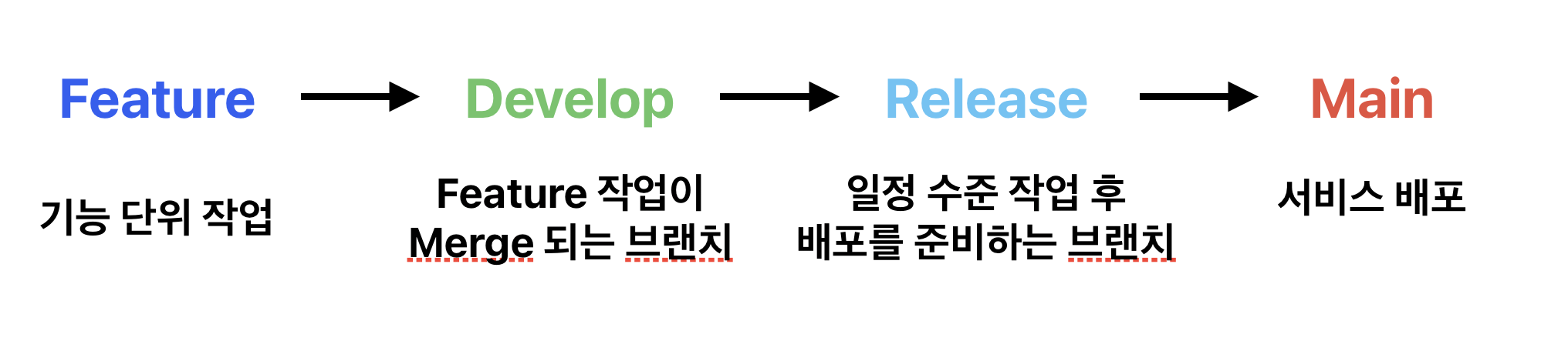 작업 흐름은 위의 그림처럼 Feature -> Develop -> Relase -> Main ( -> HotFix )순입니다.